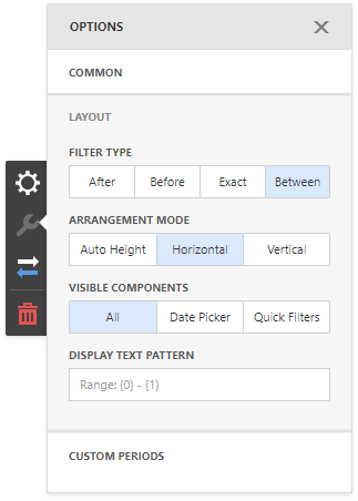 Quick filters in the Date Filter item can be arranged horizontally or vertically. The default mode is auto height, in which quick filters are displayed horizontally and the dashboard item shrinks automatically to fit the items and save space.