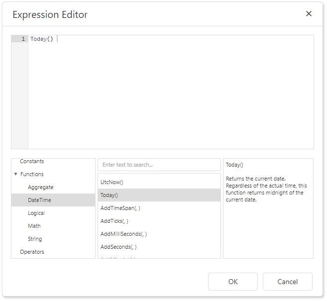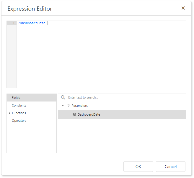 Select the Fields section in the Expression Editor, double-click the predefined dashboard parameter, and click OK.